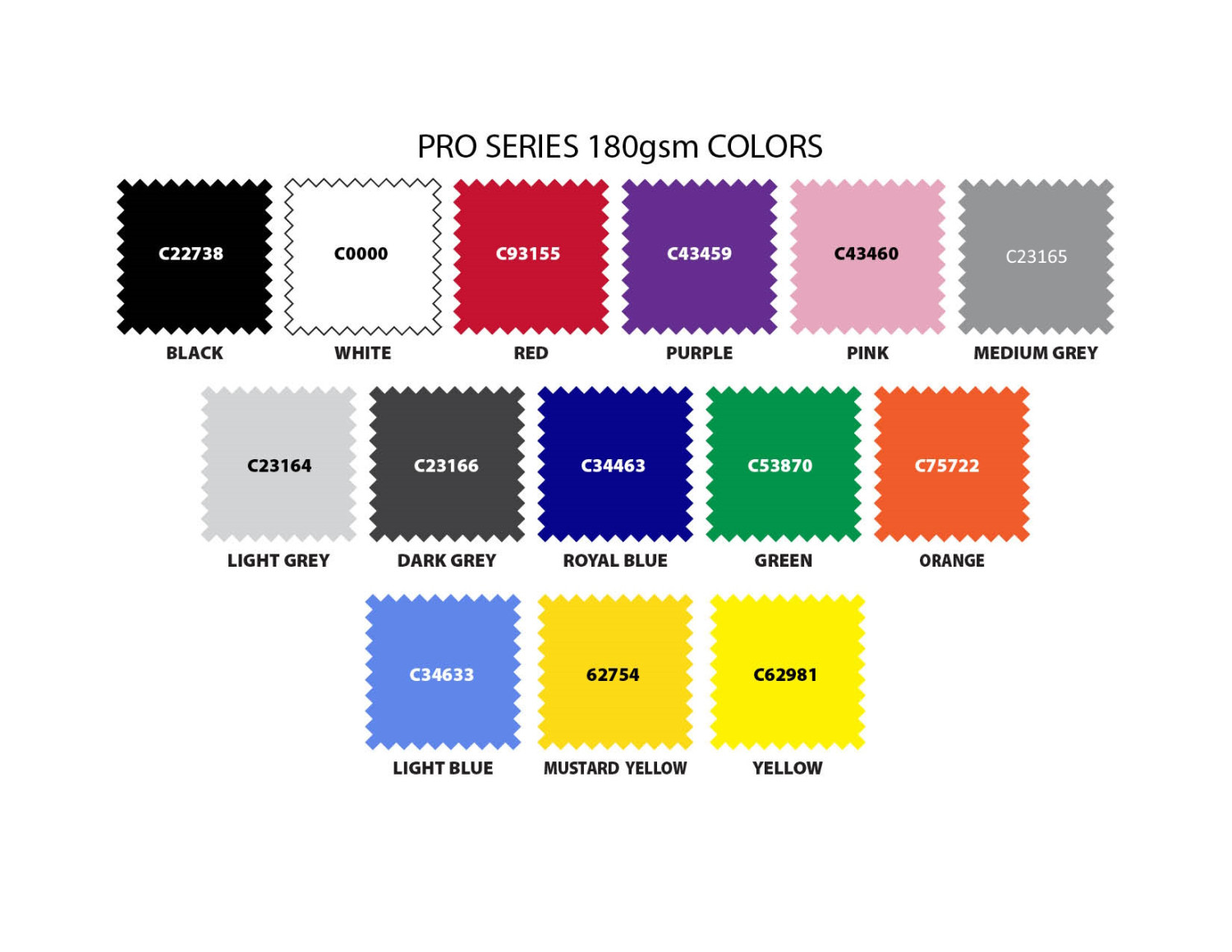 Standard PRO Series Colors: Black, White, Red, Royal Blue, Sky Blue, Yellow, Kelly Green, Purple, Grey, Silver, Pink, and Orange.