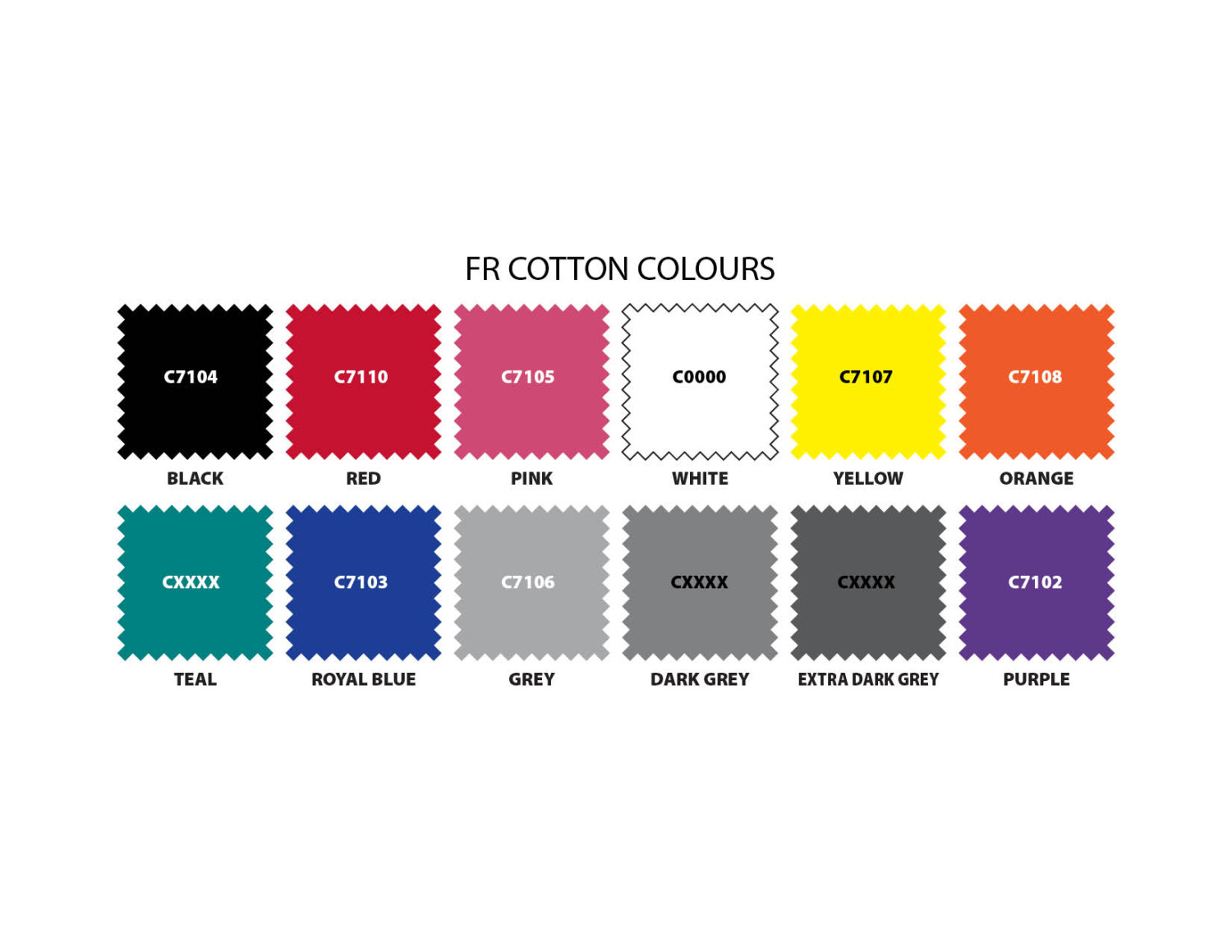 FR Cotton Color Selection: Black, White, Red, Royal Blue, Pink, Yellow, Orange, Teal, Grey, Dark Grey, Extra Dark Grey, Purple